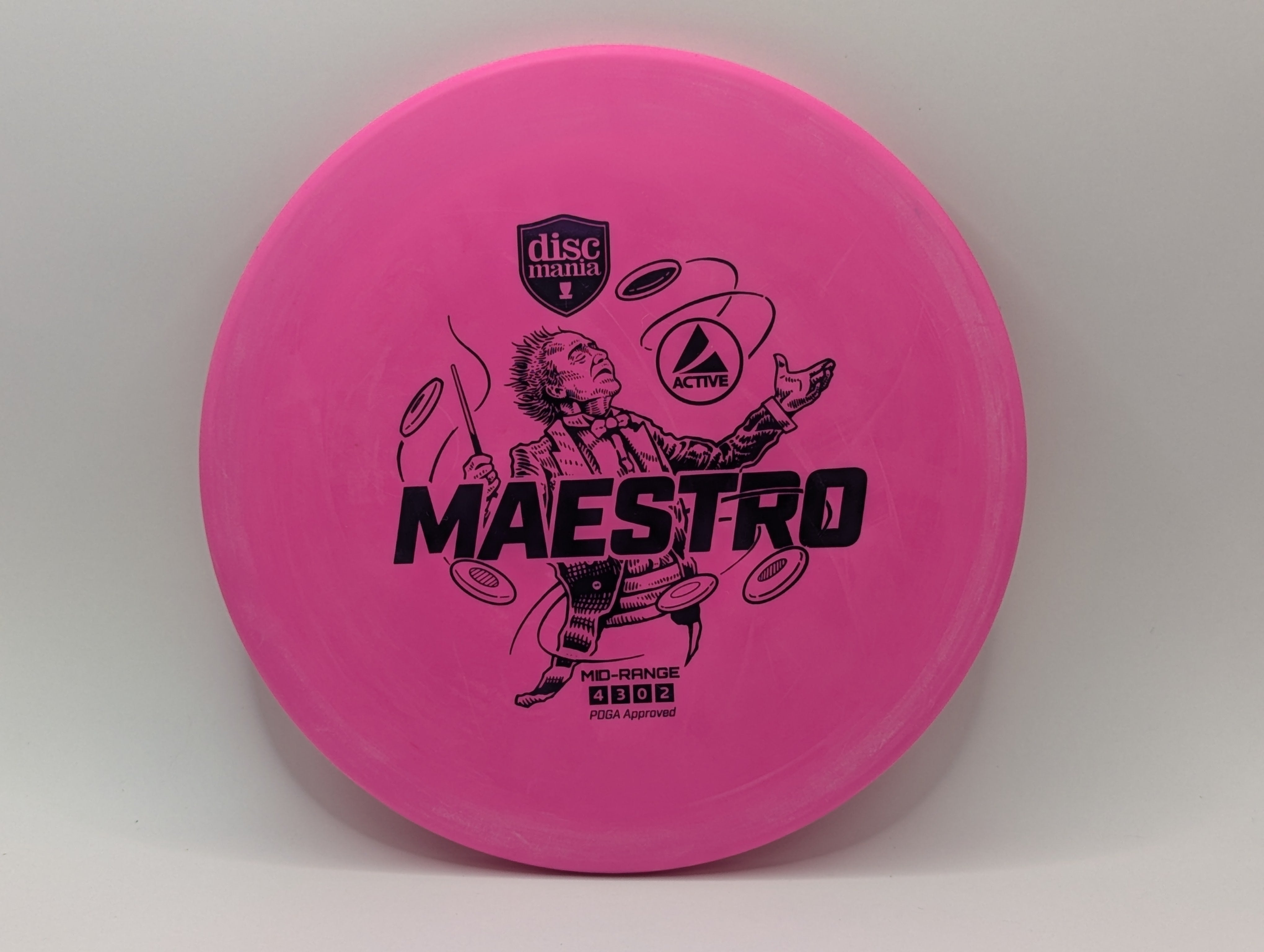 The Maestro is the brand new midrange featured in Discmania’s Active lineup. The Maestro is a low profile midrange with a bead that helps flight as well as making sure the disc releases smooth from the hand every time. This midrange has a straight flight with a slight slow speed fade making accurate approach shots a regular part of your game. While most midranges have a larger diameter, the Maestro features the same diameter as drivers and putters making this disc fit more comfortably in the hand.