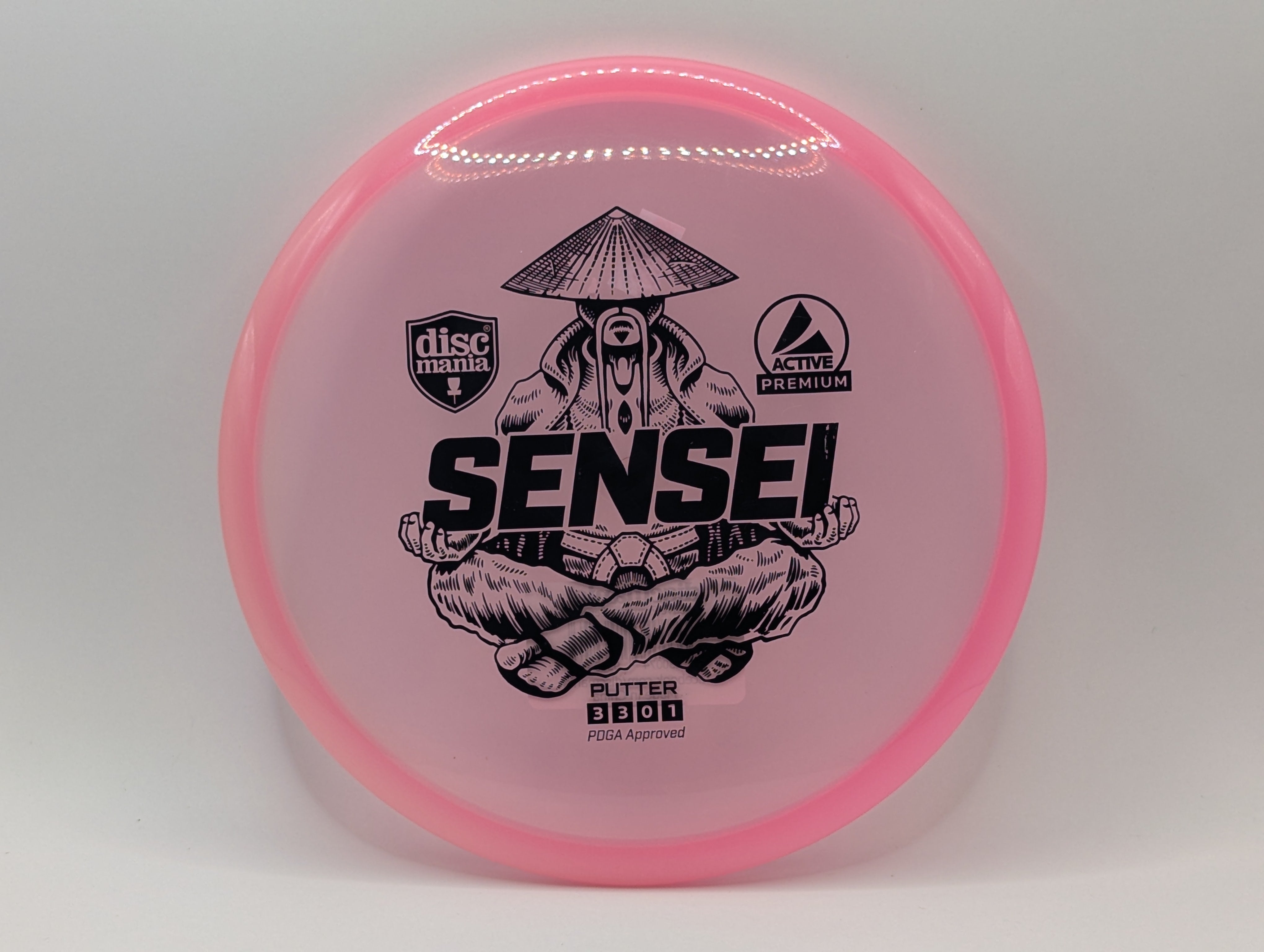 The Sensei is a low profile putter that fits well in any hand size. The disc is designed for all types of approach shots and putts. The flight of this disc is straight in high speeds and it offers a dependable fade as the speed and rotation slows down. Great choice for beginners and more experienced players alike! The Active Premium plastic is transparent with great durability.