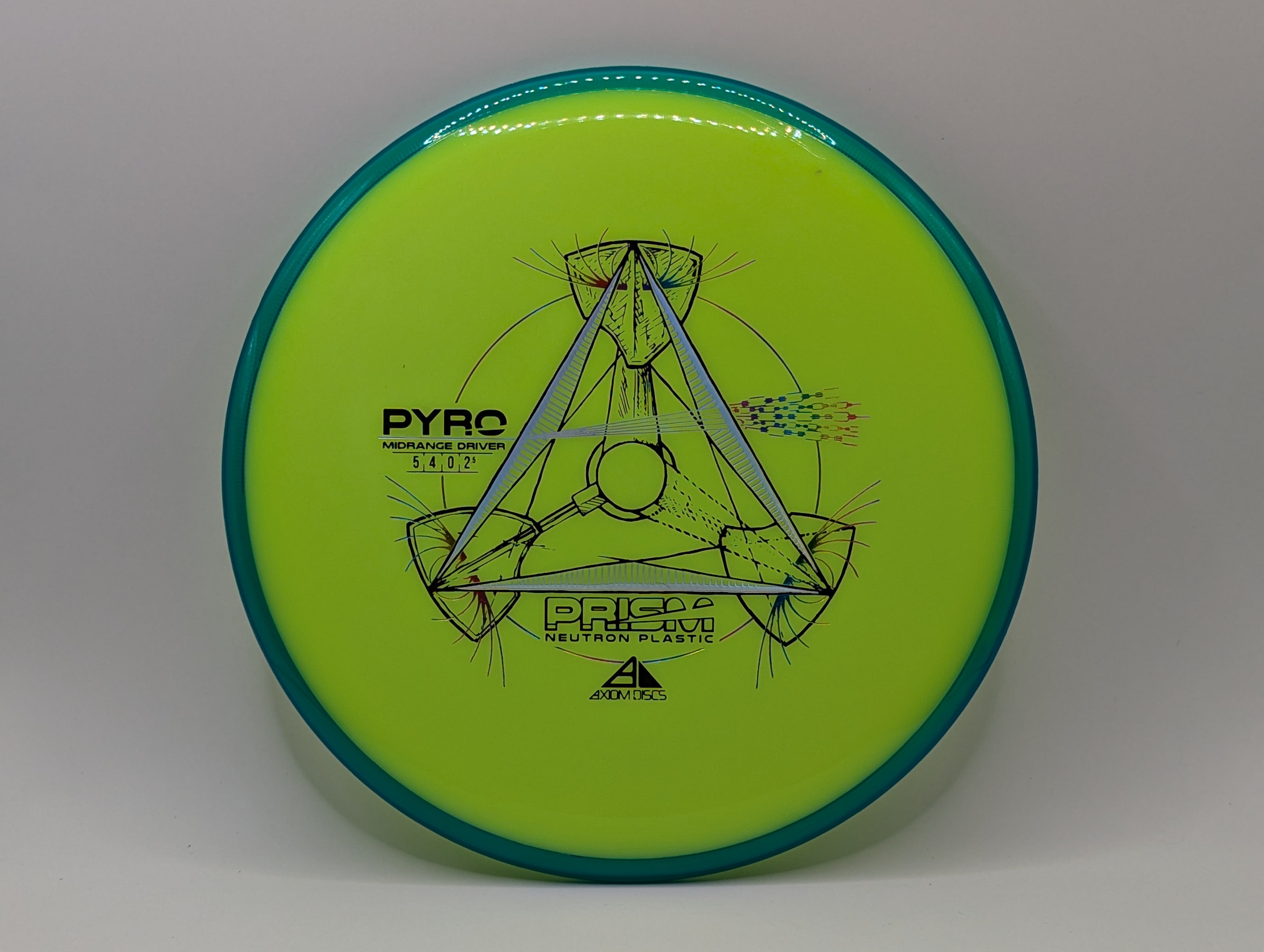 The Prism Pyro is debuting with a stock triple-foil stamp, that in combination with a Proton core and Prism rim produces a stunning dual-toned translucent disc. The Prism Proton Pyro was designed as Axiom’s first overstable Midrange with more glide than the MVP Deflector and a commanding stable finish. The Pyro has enough stability for consistent flights in strong winds and powerful throws without losing its line and turning off target.