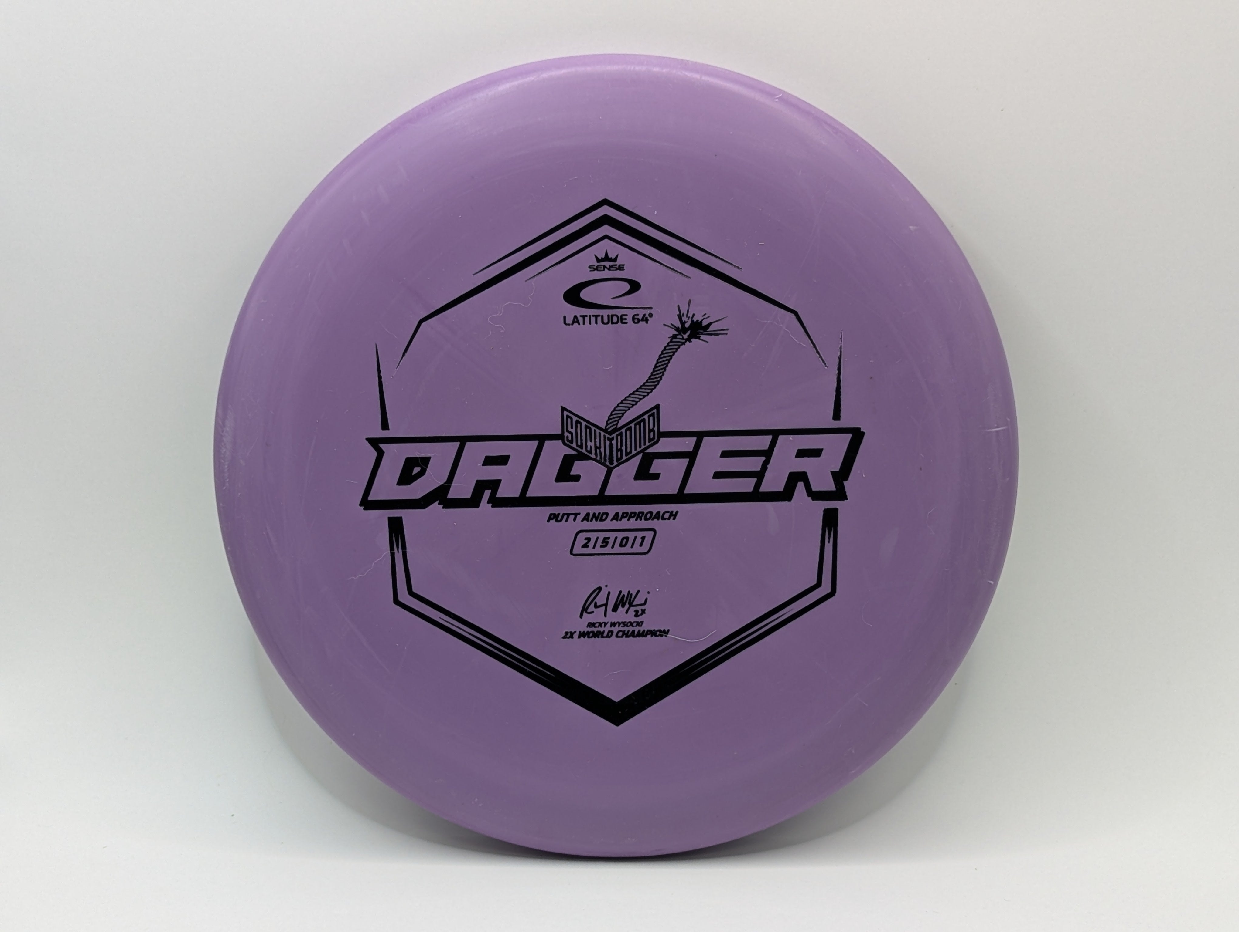 The Dagger is a deep dish putter with a bead. The deep dish means that more air can be trapped underneath the disc, making the Dagger stay longer in the air. The slow and stable flight gives you more control in your short game.
