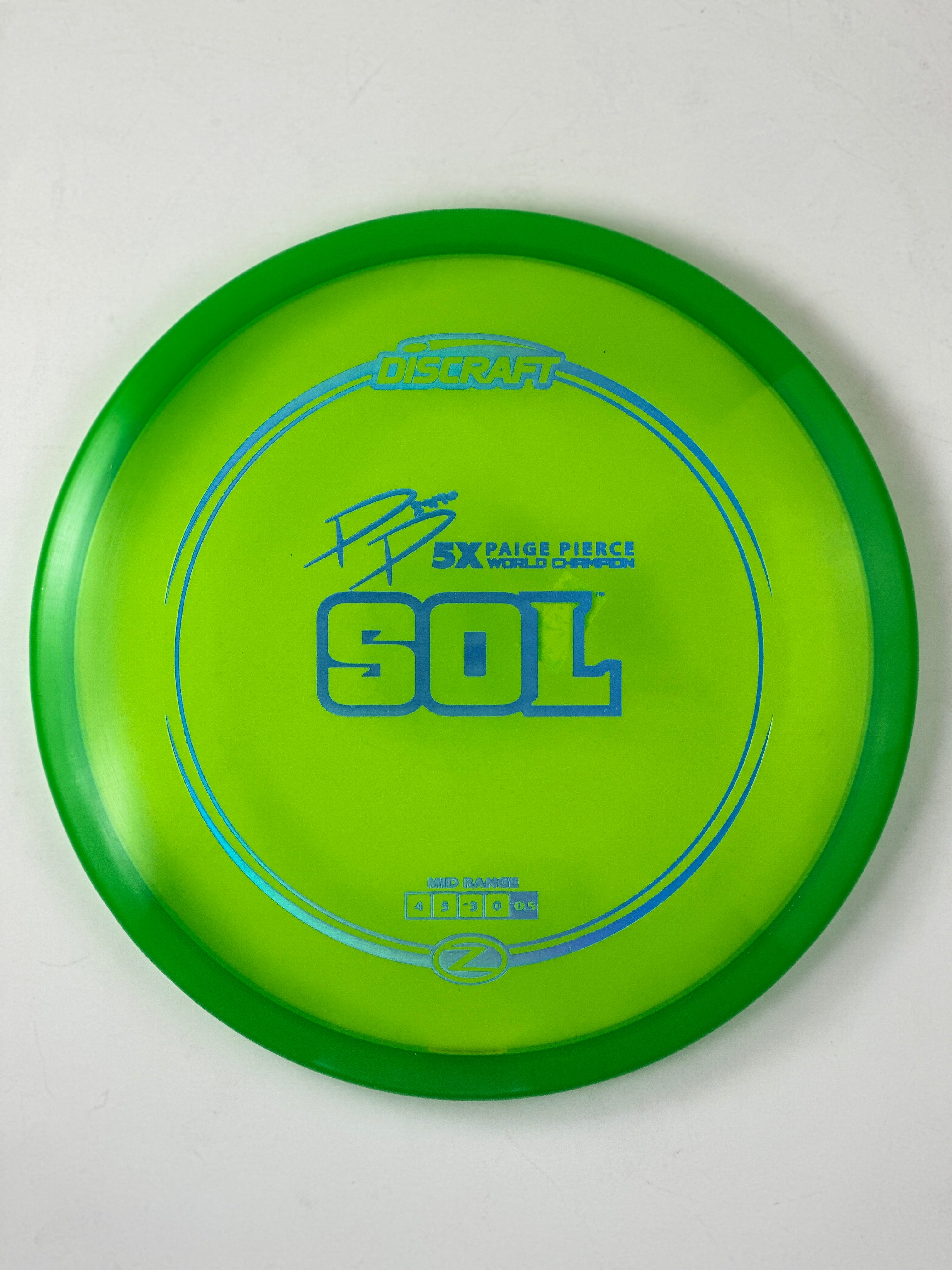 Slightly understable midrange, throw the Sol with speed and watch it float out gently to the right. The perfect disc for straight and anhyzer approaches. The Sol was the 2018 Ace Race disc.
